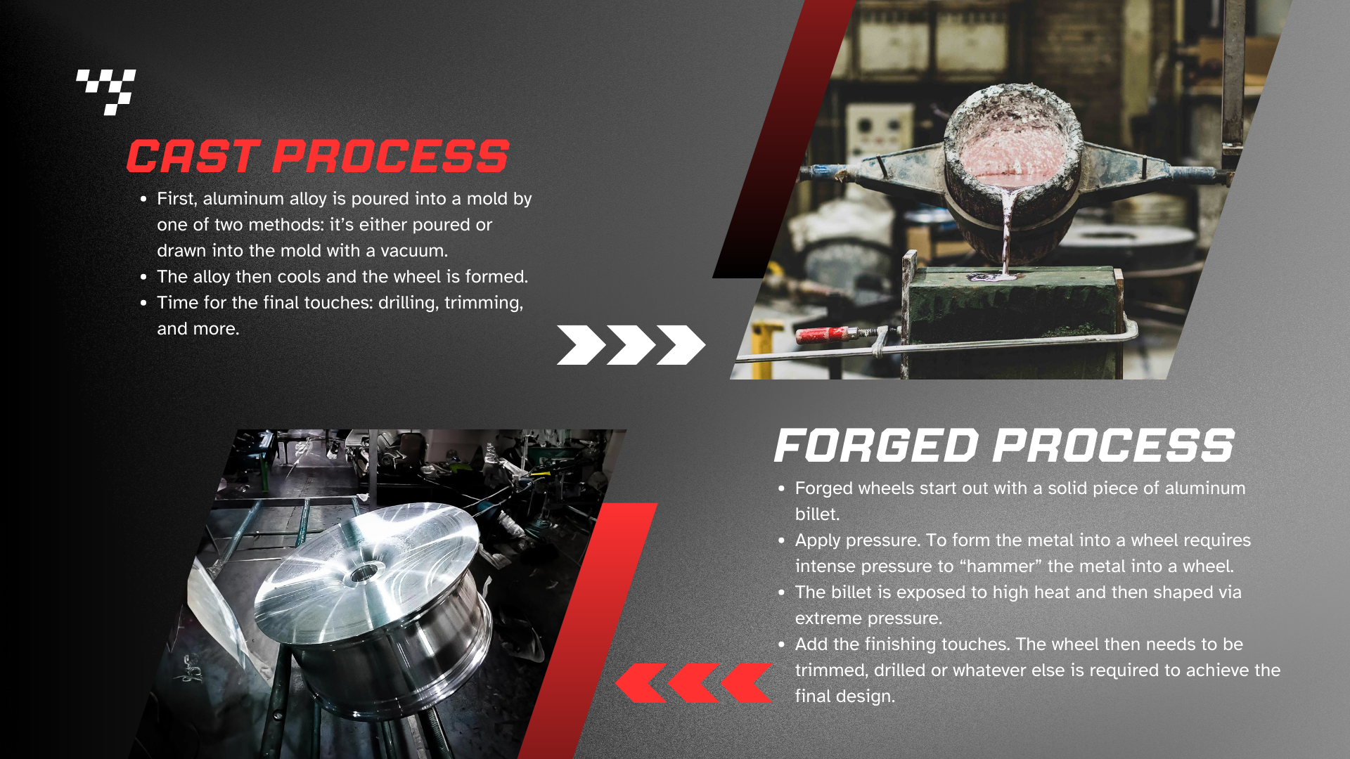 🔴Cast Wheels: Produced by pouring molten aluminum into molds — more porous and less durable